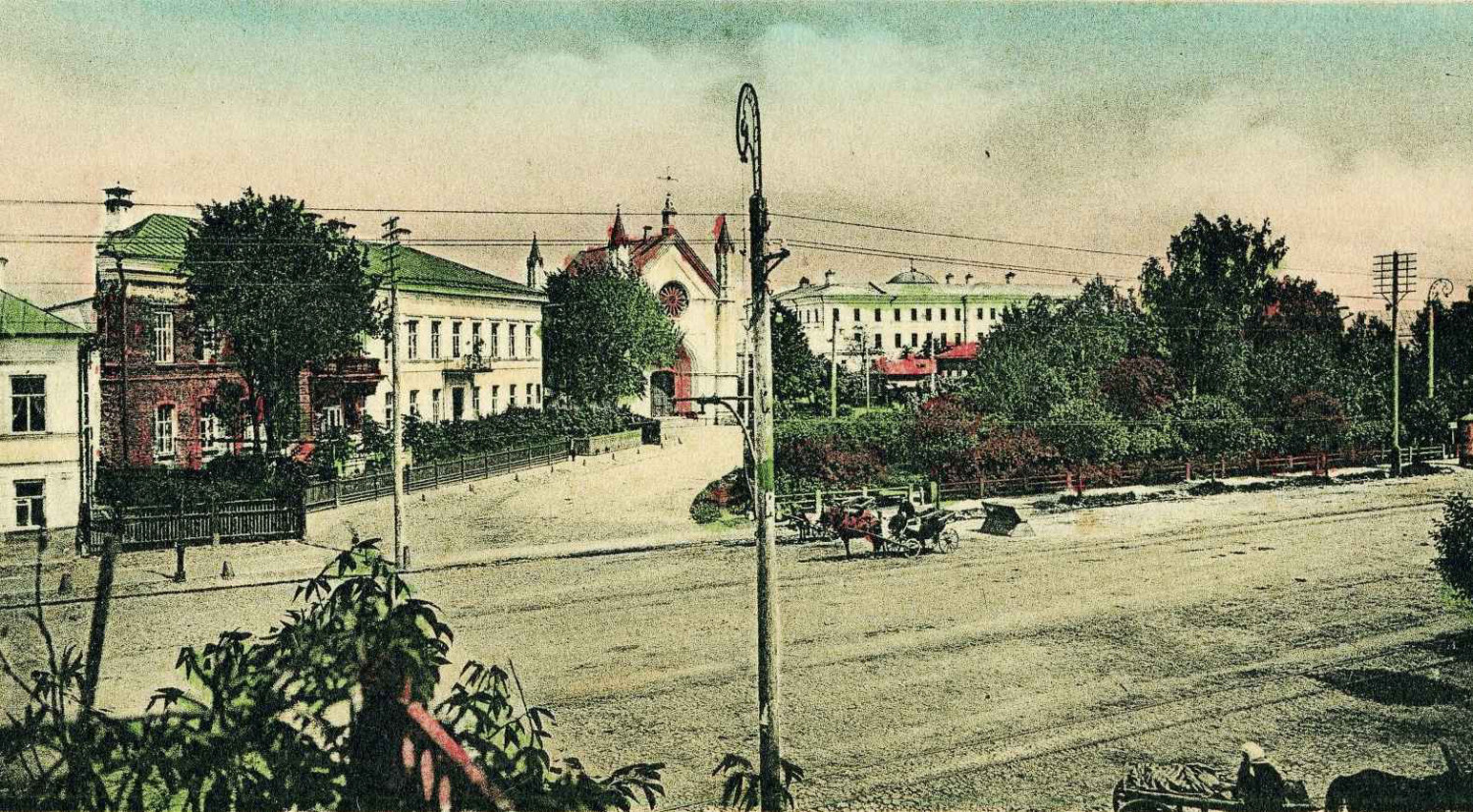 Изображённый на снимке слева от кирхи каменный двухэтажный дом в начале XX века принадлежал Александру Петровичу Фёдорову и Фейге Гиртовне Кадыш. Как и лютеранский храм, его разобрали при реконструкции Пушкинской площади в 1960-е гг. Такая же участь постигла и дом купца Д. М. Фадеева, стоявший на углу площади и улицы Советской. Небольшой фрагмент этого здания виден слева на фотографии.